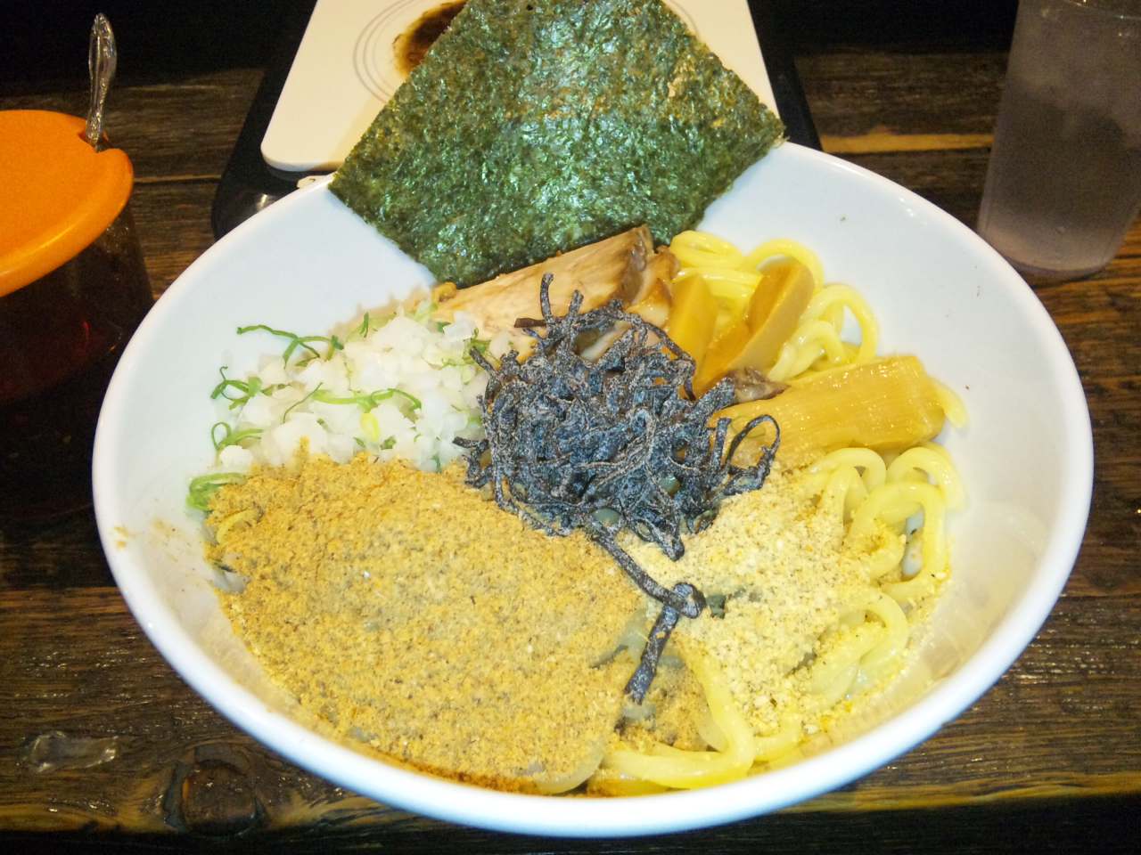 麺はつけ麺の麺と同様。味付けは非常に魚介の強いつけめんとほぼ同様の味。