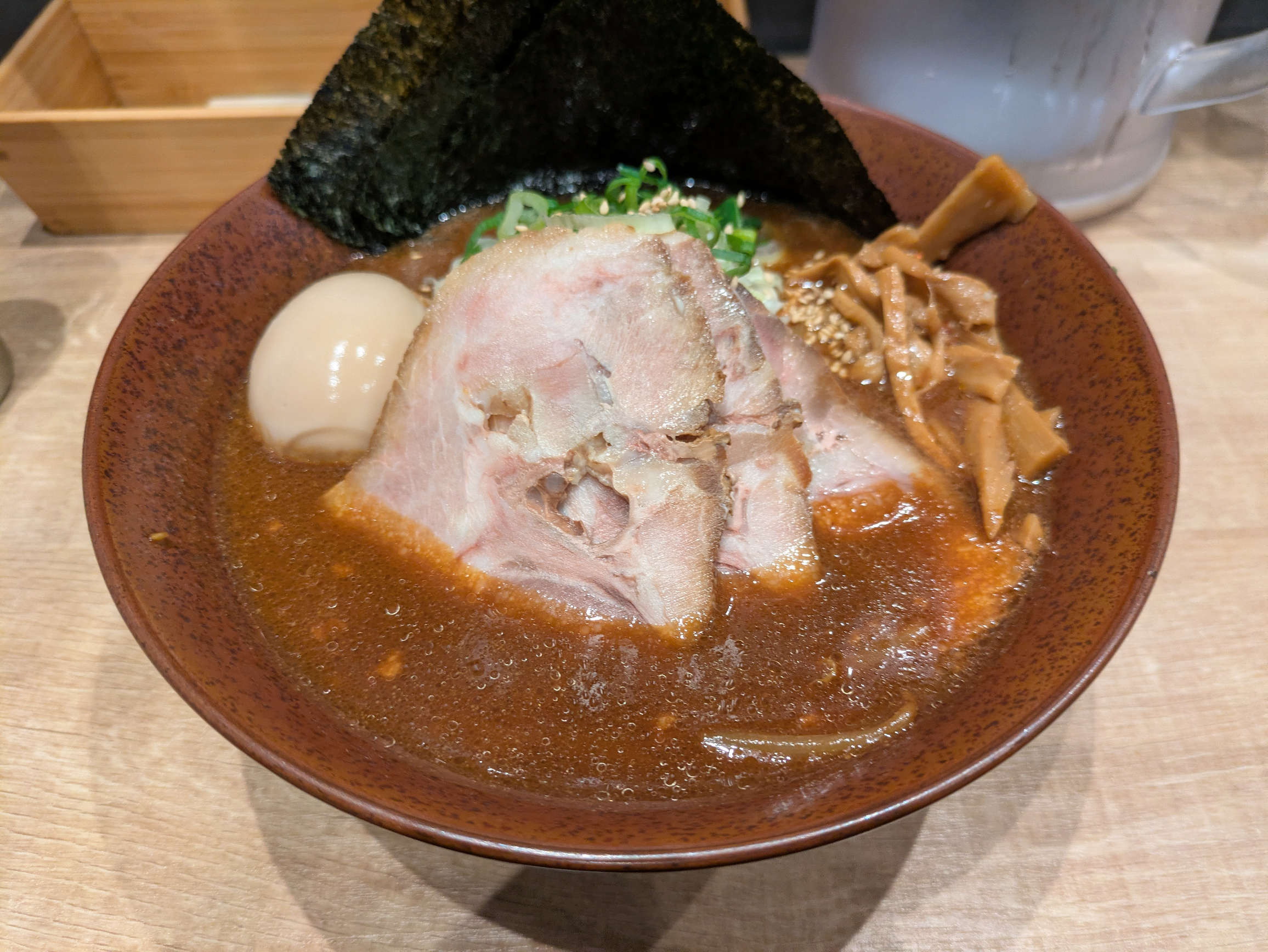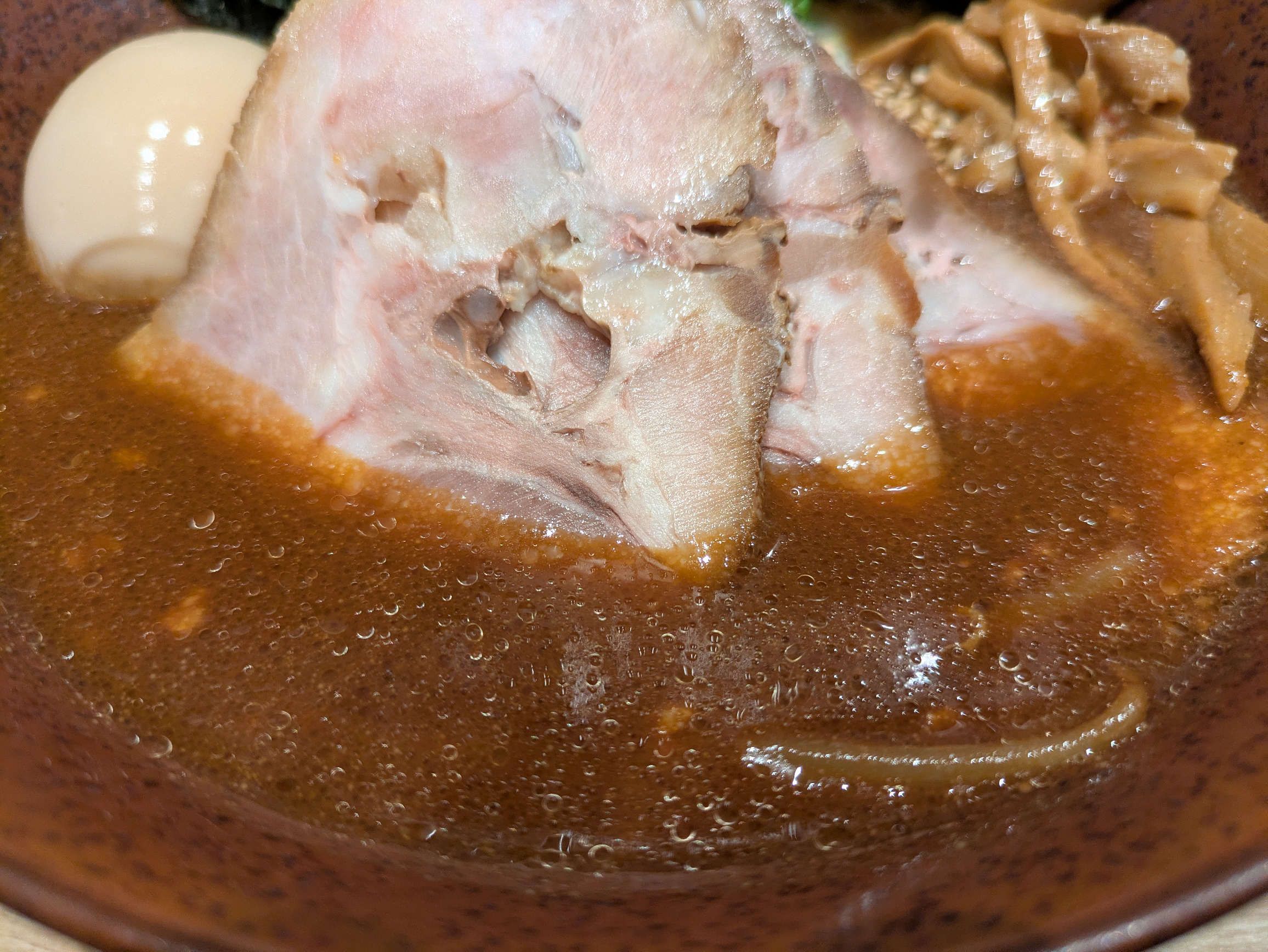 味わいは、赤味噌の渋めの独特の味わいと思いました。他のみそラーメンとは一線を画しているものと考えます。渋い苦味とコク、風味豊かなほのかな酸味。赤味噌でしか表現できない味わいをこれでもかと表現しきった一杯でありましょう。